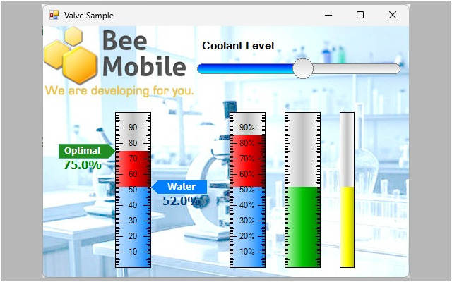 Valve does this by drawing a rectangular indicator, highlighting its minimum, maximum and current values. Valve is capable of drawing a number scale with tick marks. The labels over tick marks are generated automatically, but custom labels can also be provided. Finally, Valve is capable of drawing textual labels, highlighting importance of certain values on the valve’s scale (optimal value, critical value, error value, danger value, etc.).