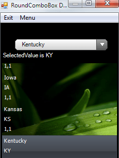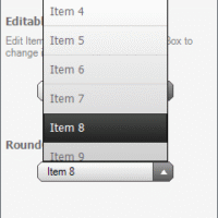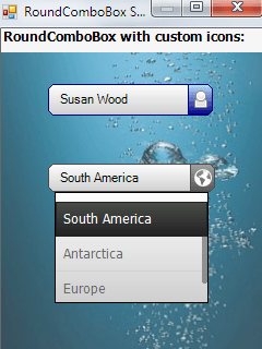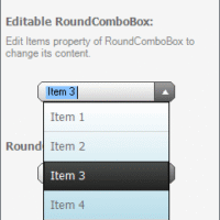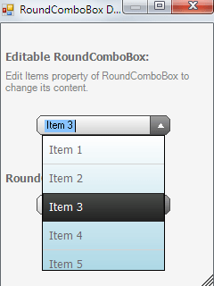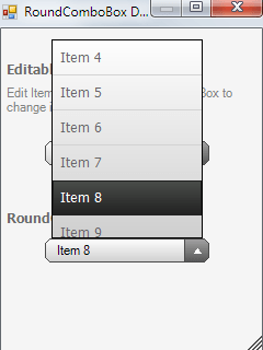 NEW: Databinding support allows you to bind your RoundComboBox to different data sources (e.g.array, List<>, DataTable, SQL CE DataBase). New improvement is also a possibility to use chosen PNG image instead of a predefined arrow which is used for expanding list of item.
