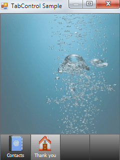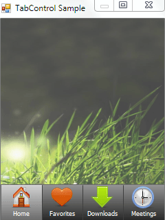 TabControl gives you the ability to set the size of tabs, allowing users to switch tabs with a touch of their finger. You can put a custom image or an icon on the tab, which allows you to create more appealing applications, and can give your product international appeal by allowing word-free selection. You can also blend TabControl seemlessly into your application’s color theme with our custom gradient-fills, and place images into the background of each tab.