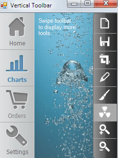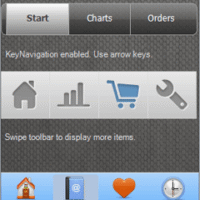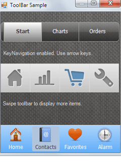 ToolBar is the perfect component to create a pane of tools in either a horizontal or vertical layout. Each tool can contain a transparent png icon along with a text label. You can seamlessly finger-scroll through sets of tools displayed across a semi-transparent, gradient-filled background. Save precious space on your display and give your users a finger-friendly experience with ToolBar.