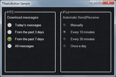 Radio buttons are perfect to give your users a choice out of several options. With TRadioButton you can bring life to your applications. Put some transparent radio buttons to your form or change the way they look completely. You can use custom pre-drawn radio buttons in the form of PNG images.